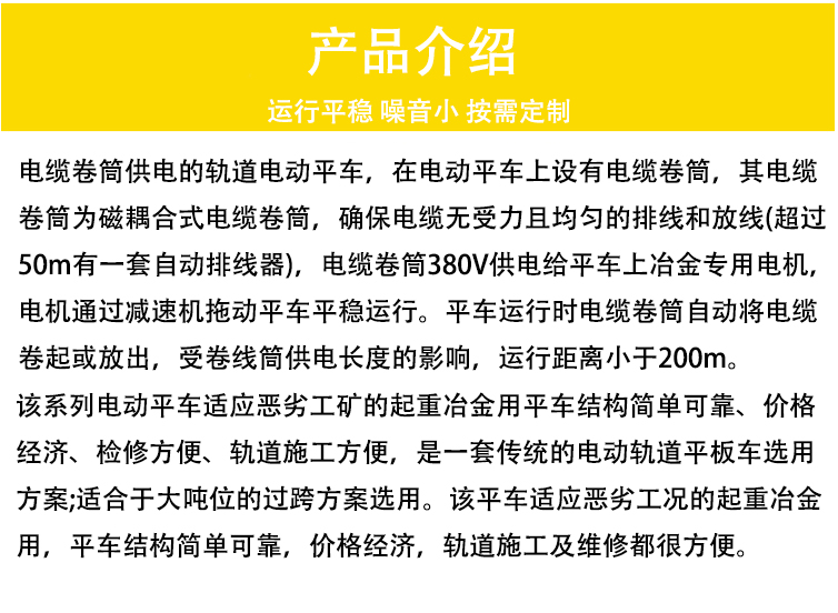 特点:以380V交流电源做为平车电源的轨道平车,为避免电缆线损伤,增加电缆卷筒做为收放线装置,由于电缆线的限制,适用于较短距离的轨道运输系统,但因其结构简单,价格低廉,因此也是车间常用的轨道运输设备。